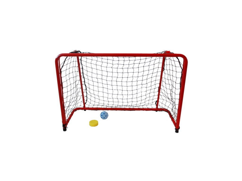 Červená ocelová trubková branka s práškovým nástřikem a přídavným rámem pro uchycení sítě.