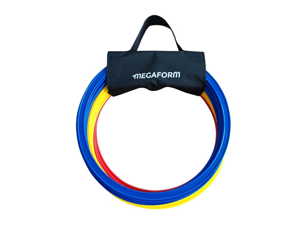 Tyto popruhy jsou navrženy tak, aby bezpečně udržely až 15 plochých obručí, 8 kulatých obručí nebo 6–8 překážek, a jsou ideální pro školy, tělocvičny a sportovní zařízení. Vyrobeno z polyesteru potaženého PVC. Rozměry: 26x16 cm.